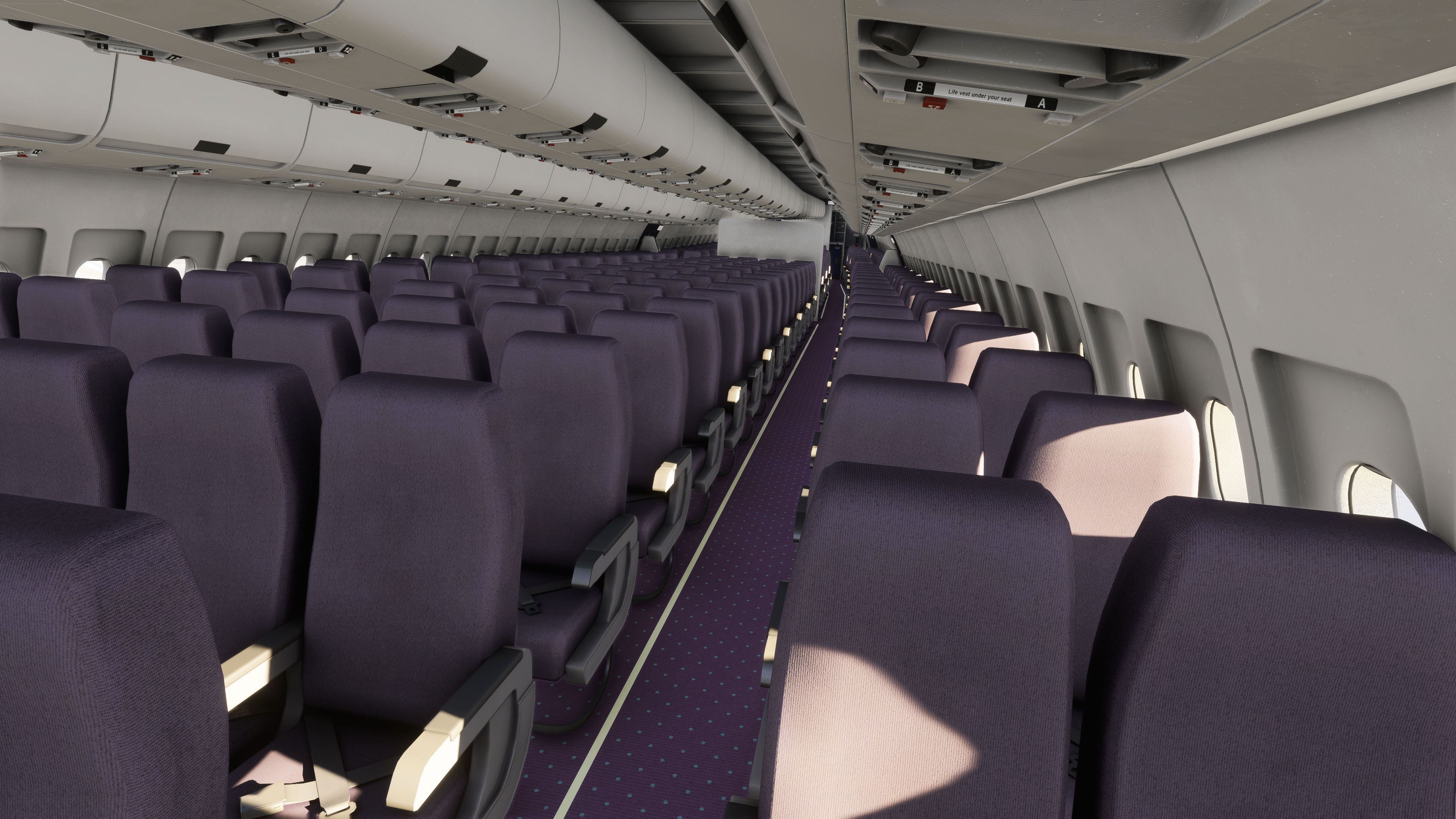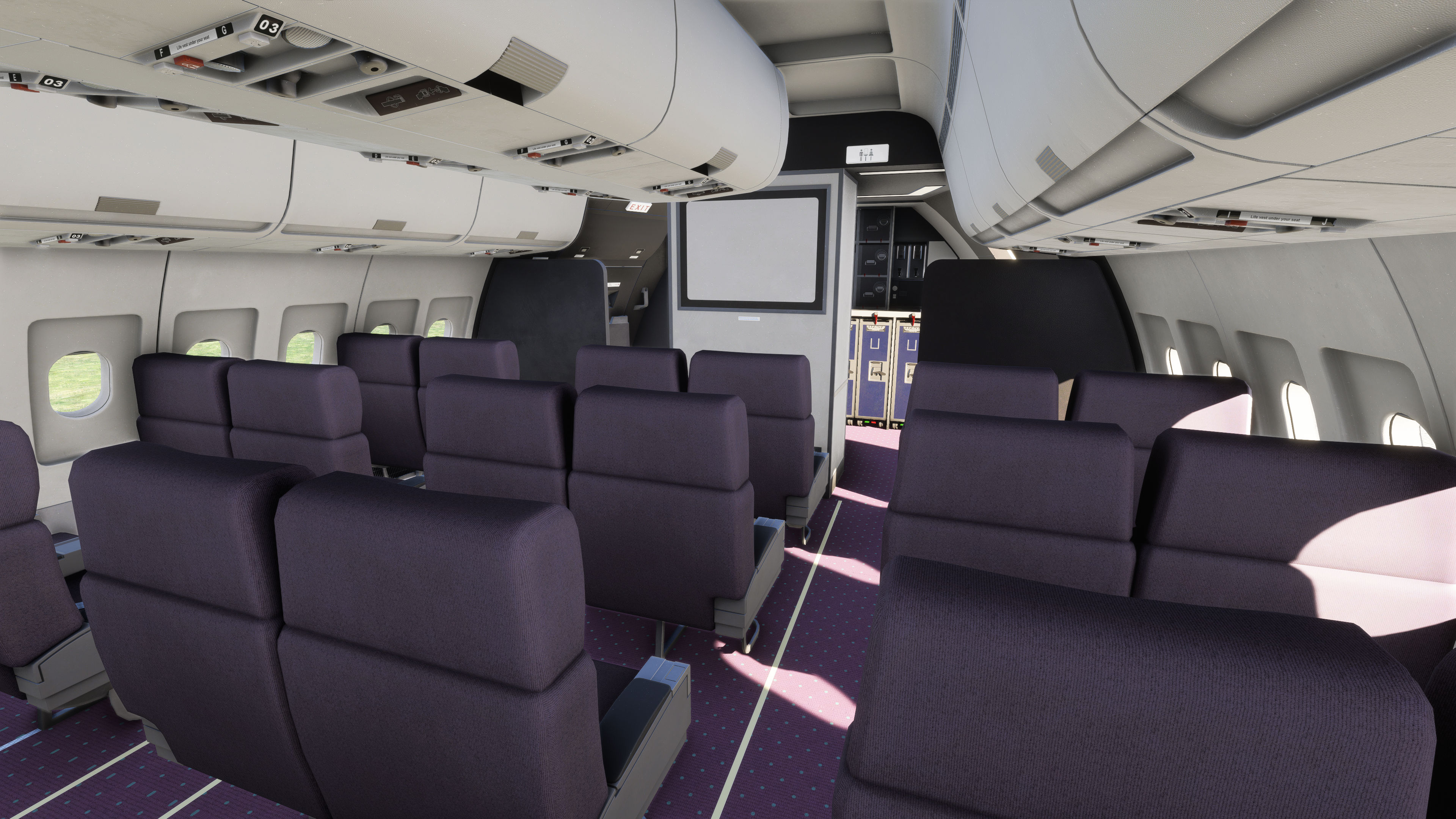 As regards the interior, we can share our first proper glimpse into the A300's vast cabin, which we have modelled in a two-class layout, straight out of the 1980s. The First Class cabin has 24 seats arranged in a 2+2+2 configuration, and the Economy cabin has 230 seats in a 2+4+2 configuration, which narrows at the rear to 2+3+2. The very noticeable incline in the rear section of the cabin is also modelled, with this incline taking up the entire aft cabin section in the A300B4, as opposed to the more modern aircraft types that share the same basic A300 fuselage.