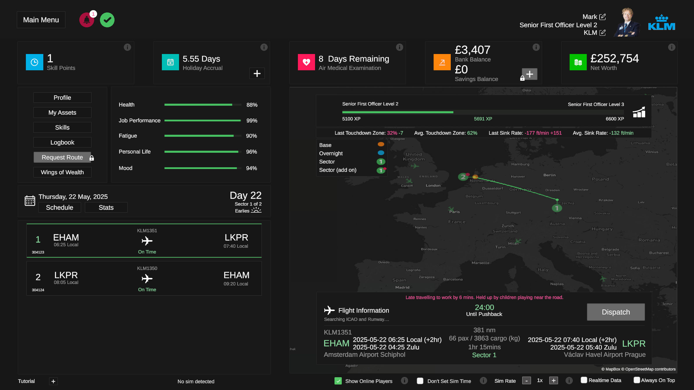 Fly the Line: Short Haul Edition - released their first product in July 2025. If you are not familiar with it, Fly the Line is a brand-new career-driven experience with a unique take on the typical flight simulation career mode experience. Rather than simply tracking your flights from point A to point B, Fly the Line incorporates lifestyle management simulation that takes place between flights. Once you have begun your journey, either with your favourite real-world airline or your own fictitious one, you will earn cash and XP that you can use to climb the ranks from Junior First Officer to Fleet Captain.