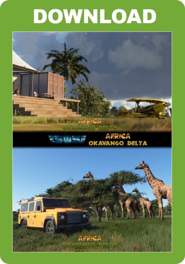 Created from the ground up using the best techniques available in Microsoft Flight Simulator, the SWS Okavango Delta is not just a scenery, but an experience like no other! Whether flying, droning or driving, there is always something to see as the Okavango wetlands are teeming with animals, tourists and safari camps.